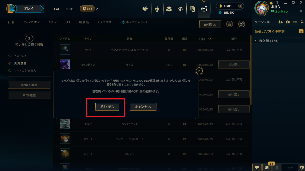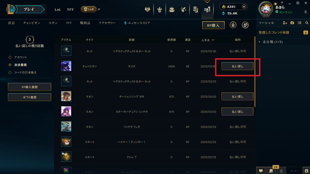4.払い戻しを行いたい商品の払い戻しボタンを押す(スキンorキャラクター)
