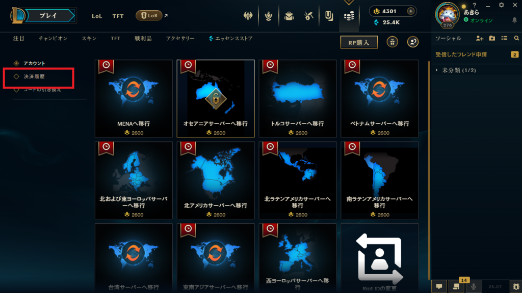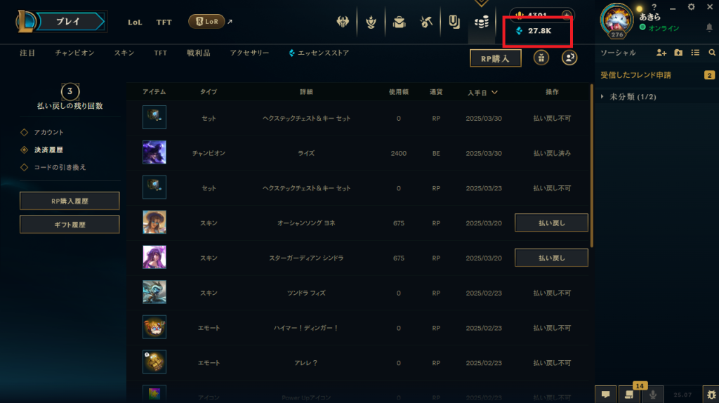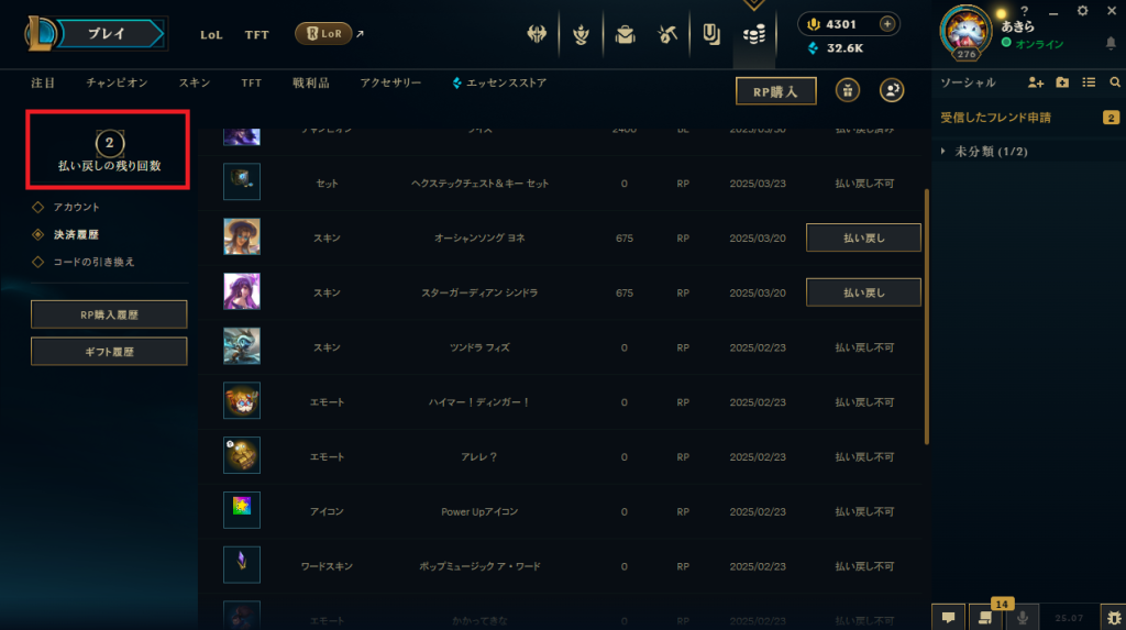ゲームの課金には通常ない制度ですがLoLのキャラクター購入とスキン購入には対応しています。